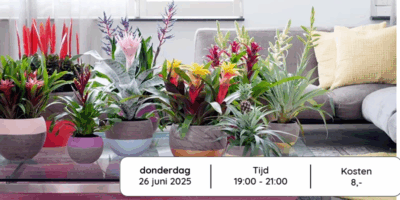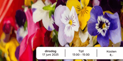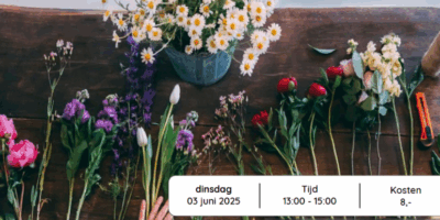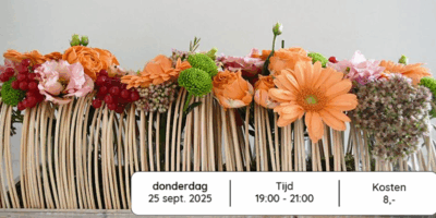 Planning----------------------Donderdag 25 september Bloemschikken19:00 - 21:00Donderdag 23 oktober Herfstkrans19:00 - 21:00Donderdag 23 oktober Bloemschikken19:00 - 21:00Donderdag 28 oktober Cupkakes versieren13:00 - 15:00Meer informatie is te vinden onder workshops in het menu of in ons programmaboekje.