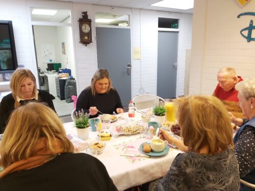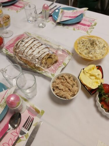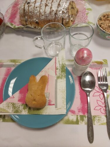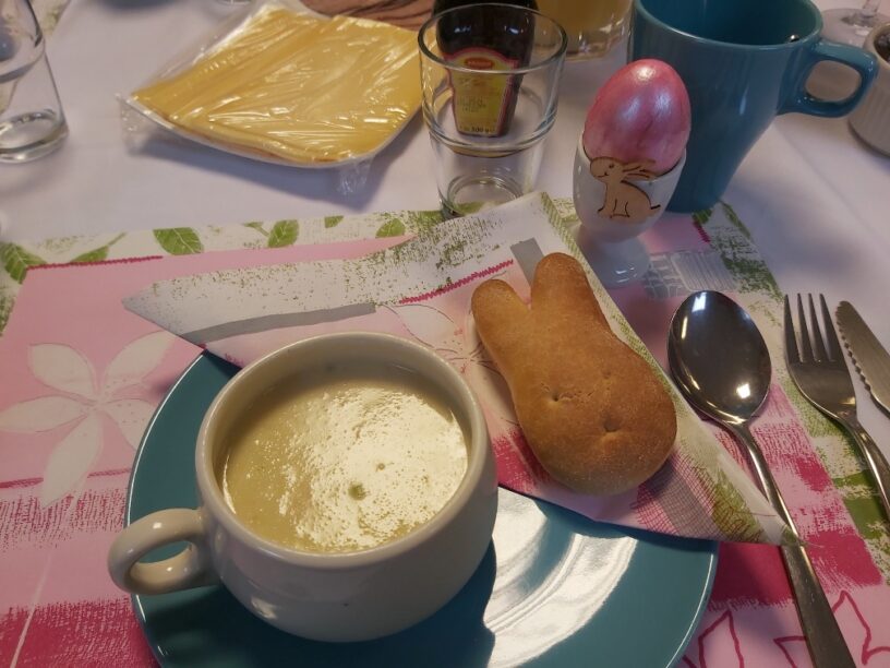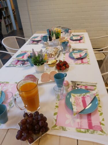 We werden heerlijk verwend tijdens de paaslunch. Een prachtig gedekte tafel met o.a. een gekookt eitje, een paashaasbroodje, een lekker soep erbij met natuurlijk volop gezelligheid. We hebben ons buikje rond gegeten.