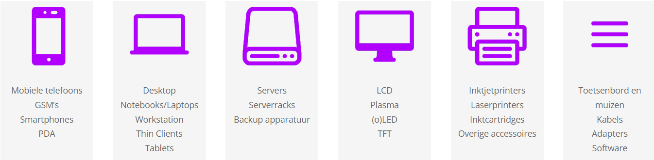 Om u een idee te geven welke apparatuur u onder meer kunt inleveren, volgt hier een overzicht van de meest ingeleverde apparatuur. Wij maken geen onderscheid tussen werkende of defecte apparatuur, u kunt dus zowel defecte (bijvoorbeeld mobieltjes met een kapot scherm) als nog werkende apparatuur bij ons inleveren.