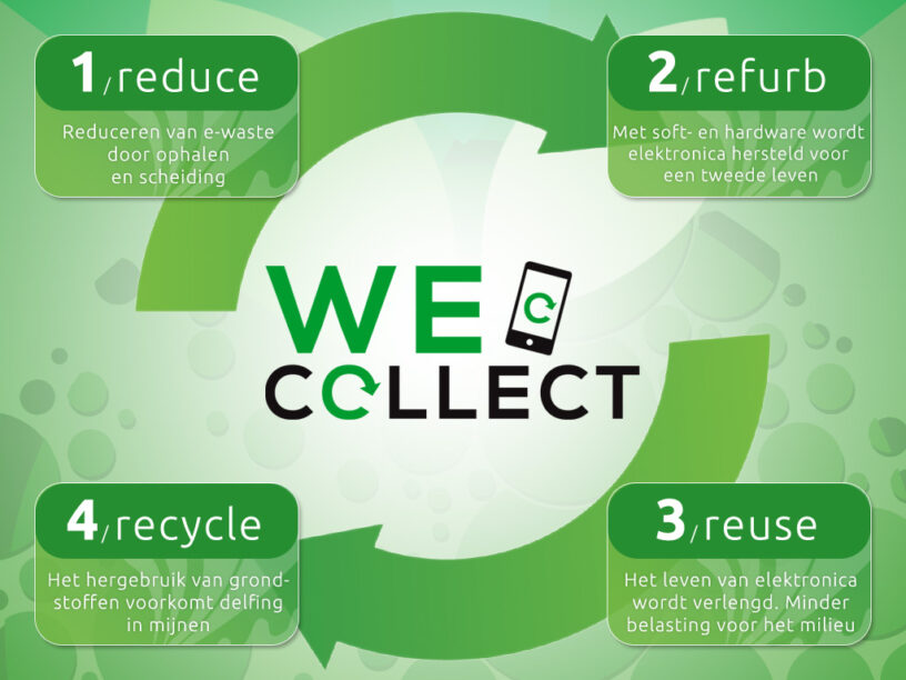 Ook u kunt helpen door simpelweg uw overbodige of afgeschreven mobiele telefoons en/of ICT-apparatuur kosteloos bij ons af te geven. Wij zorgen dan samen met We-Collect voor een goede verwerking van de spullen. Eventueel achtergebleven data worden gecertificeerd vernietigd door onze recyclingpartner Brantjes Datavernietiging of HKS Scrap Metals B.V. en vervolgens duurzaam verwerkt.